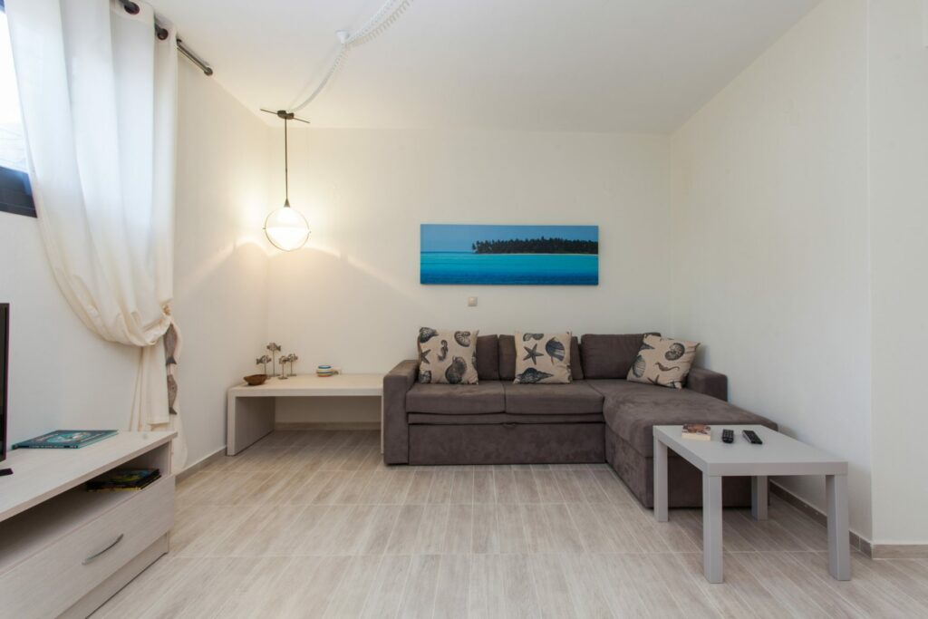 Στο ισόγειο οι επισκέπτες μπορούν να επωφεληθούν από το άνετο καθιστικό με άμεση πρόσβαση στη βεράντα και πλήρως εξοπλισμένη κουζίνα.