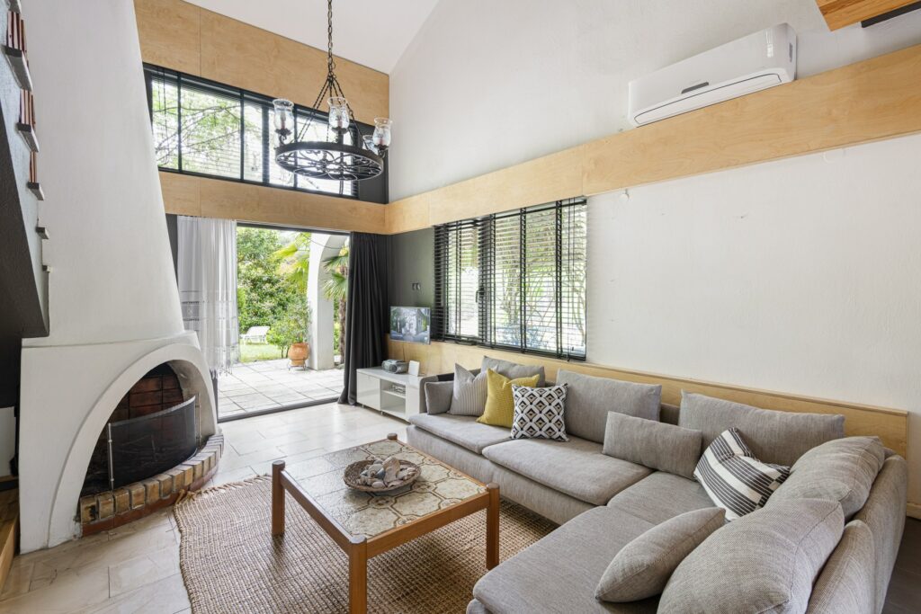 Στον κάτω όροφο υπάρχει άφθονος χώρος: το καθιστικό οδηγεί κατευθείαν στην αυλή, ενώ το γωνιακό τζάκι προσφέρει ζεστασιά. Η κουζίνα είναι πλήρως εξοπλισμένη με όλες τις ηλεκτρικές συσκευές ακόμα και καφετιέρα και πλυντήριο πιάτων.