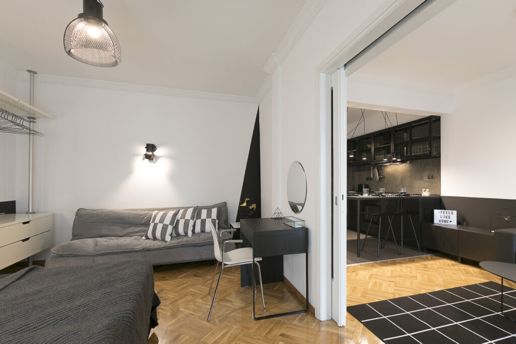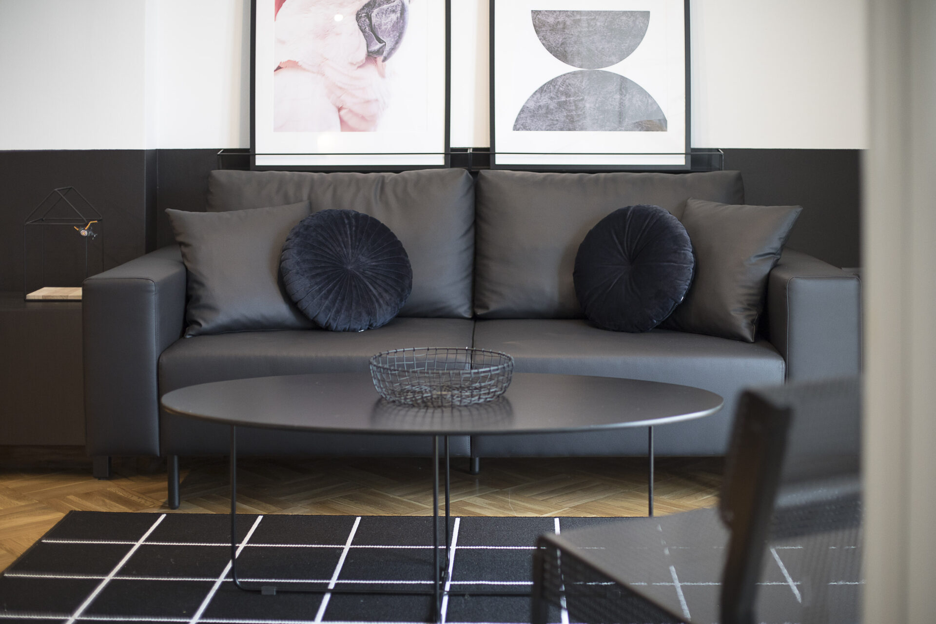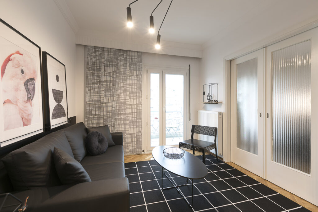 Στο σαλόνι θα βρείτε έναν άνετο καναπέ και μία πολυθρόνα, καθώς και μια επιτοίχια smart τηλεόραση. Από εδώ, υπάρχει επίσης πρόσβαση στο μπαλκόνι, όπου υπάρχουν ένα μικρό τραπέζι και δύο καρέκλες, ιδανικά για να απολαύσετε τη θέα της πόλης.