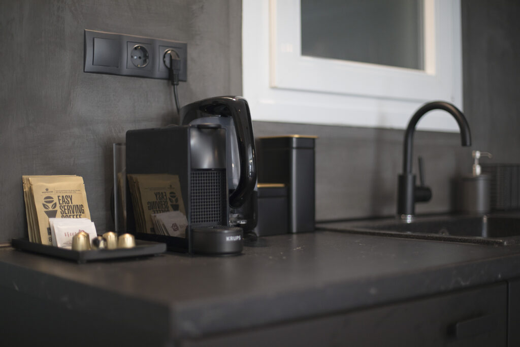 Η κουζίνα ενιαίας διαρρύθμισης είναι πλήρως εξοπλισμένη με όλες τις απαραίτητες συσκευές, όπως φούρνο, εστία μαγειρέματος, μίνι ψυγείο, μηχανή Nespresso, βραστήρα και τοστιέρα. Δίπλα στην κουζίνα βρίσκεται ένα ψηλό τραπέζι φαγητού με τρία σκαμπό, δημιουργώντας έναν άνετο χώρο για να γευματίσουν οι επισκέπτες.
